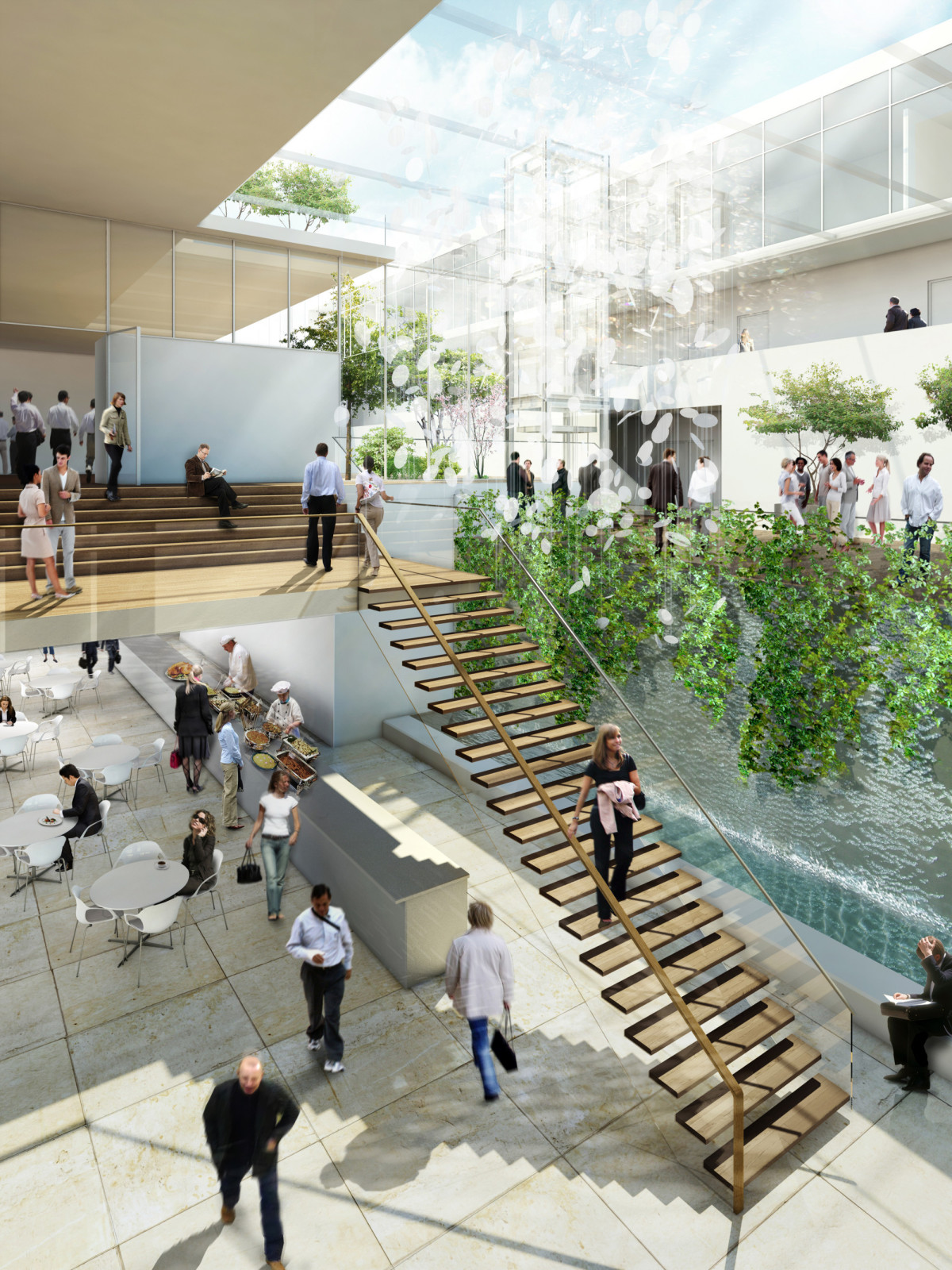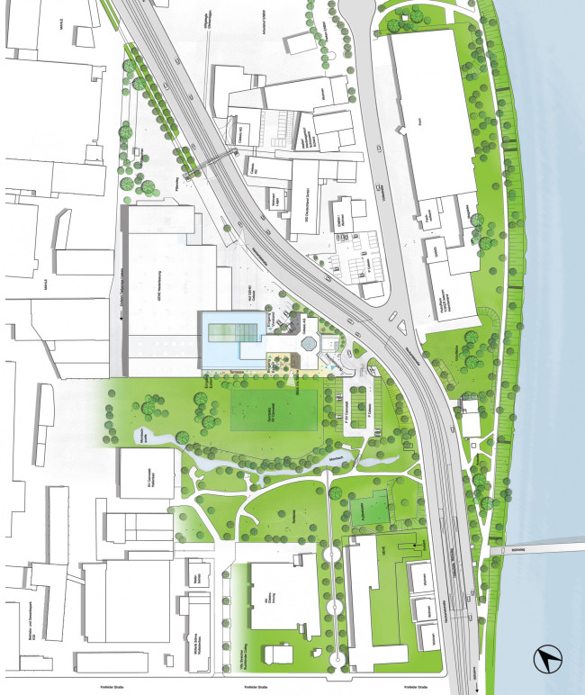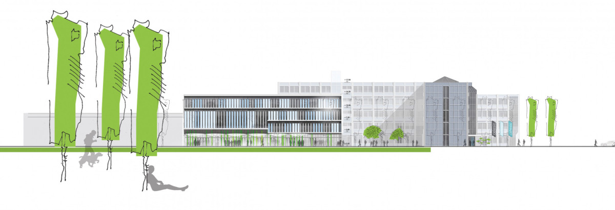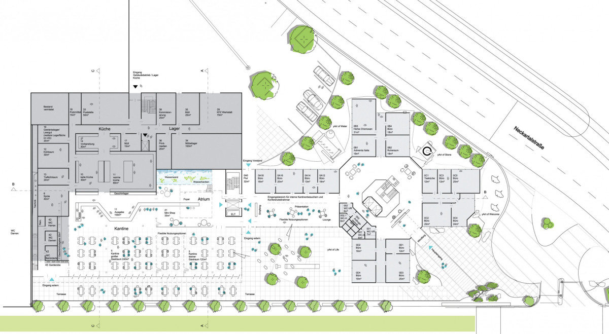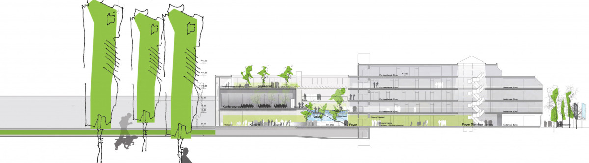 Den Mittelpunkt des Atriumgebäudes bildet eine grüne Oase, welche den Charakter und die Firmenphilosophie der Konzernzentrale widerspiegelt. Sämtliche gewünschten Nutzungen partizipieren von diesem im Zentrum liegenden Lichthof. Eingangsbereich und Erschließungsflächen, Foyer und Kommunikationszone, Catering und Küche, Besprechungsräume und Konferenzbereich gruppieren sich um die grüne Lunge, welche sowohl als Wintergarten als auch als offener Hof genutzt werden kann. Sie schafft optimale Belichtung, natürliche Belüftung, bietet Raum für Gespräche und Orte für Gedankenaustausch sowie Zonen für die geistige Einkehr. Die durchgrünte Mitte trägt auch zur Verwirklichung eines nachhaltigen Energiekonzepts für ein zukunftsorientiertes Unternehmen bei.