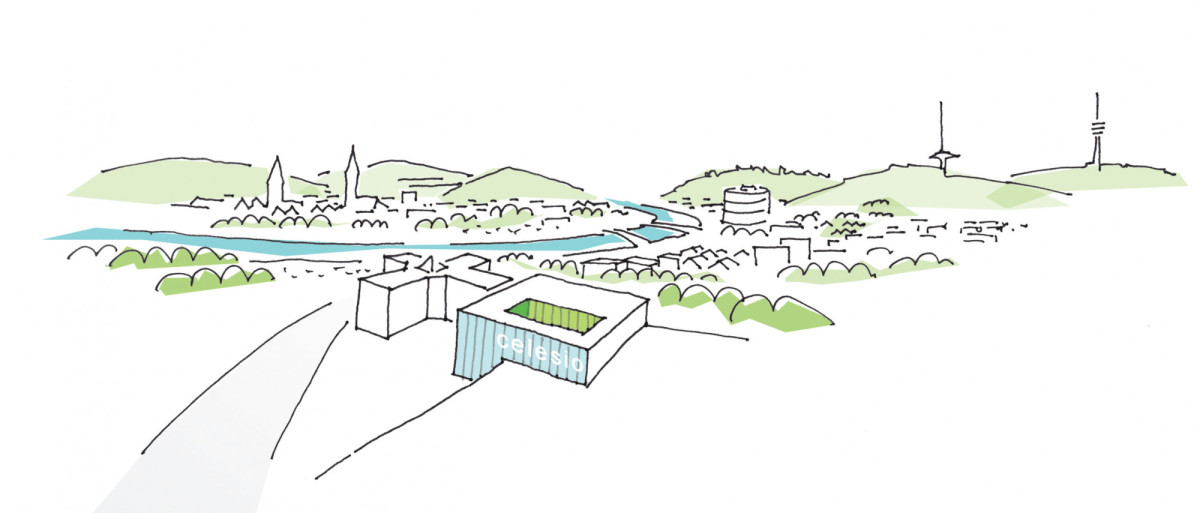 Aufgabe ist es eine Kantine, einen repräsentativen Konferenzbereich und zusätzliche Arbeitsplätze für die Celesio AG zu schaffen. Die Lage ist klar zwischen dem bestehenden Verwaltungsbau (Sternbau) und der Hallenfläche definiert. Der Neubau soll nicht in Konkurrenz zum bestehenden Sternbau treten, jedoch eigenständig und repräsentativ sein. Es wird vorgeschlagen dem Sternbau ein Atriumhaus anzuschließen, das die unterschiedlichen Nutzungseinheiten ungezwungen aufnehmen kann.