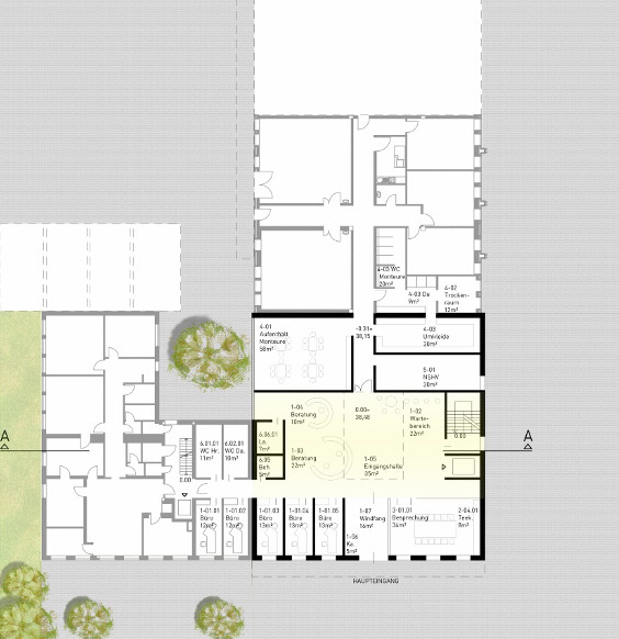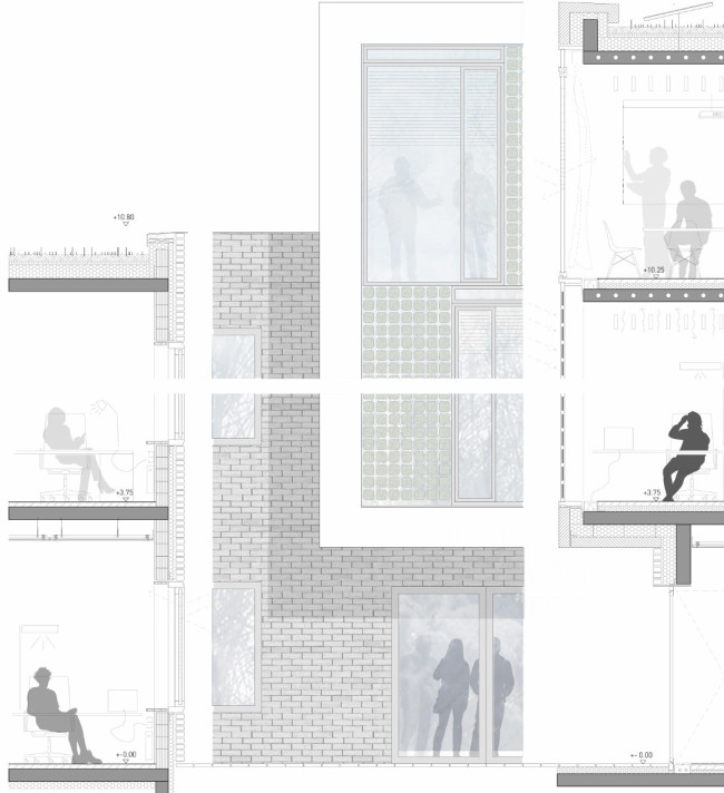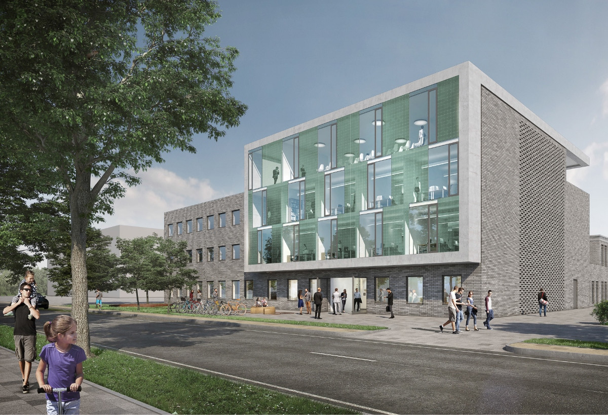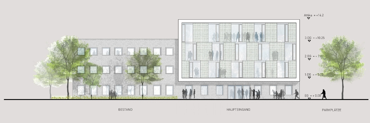 Der gegliederte, kompakte Baukörper mit einem dreigeschossigen „Schaufenster“ zu Straße formuliert ein klares, städtebauliches Statement. Mit dem Aufgreifen des Materials Ziegel sowie der baulichen Flucht wird eine überzeugende Einbindung des Bestands gewährleistet.