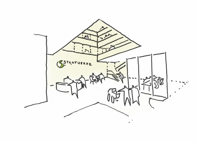 Die Gestaltung des „Schaufensters“ mit Photovoltaikelementen bringt den inhaltlichen Bezug zur Energieversorgung zum Ausdruck. Die nach Osten orientierte Fassade wirkt jedoch zu geschlossen. Die Geschosse sind klar gegliedert, gewährleisten eine gute Ordnung und weisen gute Übergänge zum Bestand auf. Der Haupteingang wirkt etwas unterdimensioniert. Die Gestaltung der Vorzone mit Wasser, Sitzbänken und Flächen für Fahrräder schafft einen attraktiven Übergang zwischen innen und außen. Über den Haupteingang wird eine zentrale Eingangshalle mit einem Atrium, das über alle Geschosse reicht, erschlossen. Somit wird ein gutes Potential für den Empfang von Kunden und Besuchern geboten. Die Trennung zwischen öffentlich zugänglichen Bereich und internem Nutzungsbereich ist gegeben. Die Büroräume sind gut proportioniert und belichtet, sodass sie eine hohe Aufenthaltsqualität versprechen. Durch die Anbindung der Büroräume in Verbindung mit den Erschließungsachsen werden unterschiedliche Grade von Transparenz und Abgeschlossenheit gewährleistet. Der Versammlungsraum mit den angeschlossenen Funktionsbereichen im dritten Obergeschoss entspricht den funktionalen Anforderungen. Die vorgeschlagene Erweiterungsfläche wird als mögliche Option angesehen, die jedoch zur Lasten des Außenbezugs gehen würde.