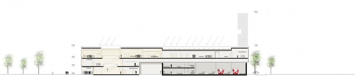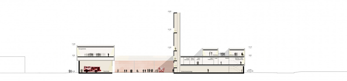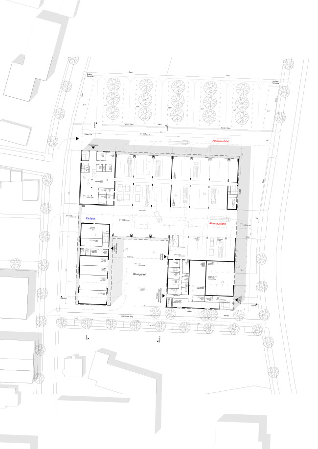 Das Feuerwehrgebäude organisiert sich erdgeschossig entsprechend seiner inneren Funktion. In den quadratischen Grundriss eingeschrieben ist der Übungshof, der sich nach Süden offen zeigt. Entlang der Bahnlinie und der Bleicherstraße werden längsorientiert zwei Riegel in Nord-Süd Richtung entsprechend der umgebenden Quartiere gesetzt, um die Straßenkanten zu definieren. Die beiden Riegel nehmen die Wohnungen und Räume der Feuerwehr auf.