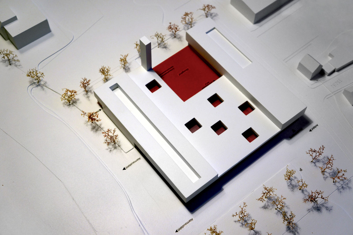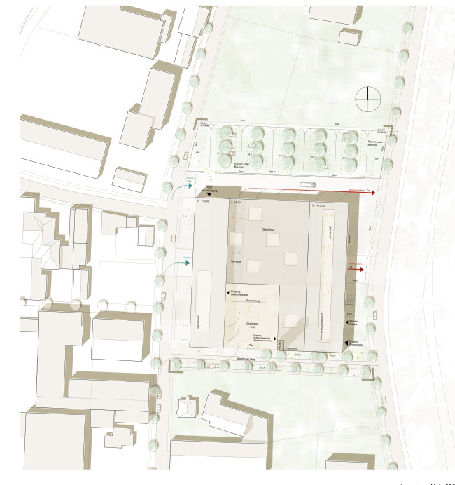 Es wurde vorgeschlagen das Gebiet um einen kompakten, selbstbewussten, quadratischen Baukörper zu ergänzen. Die Bebauung bildet eindeutige Raumkanten und gibt dem Ort eine eigene, angemessene Prägung.