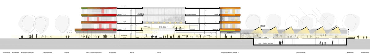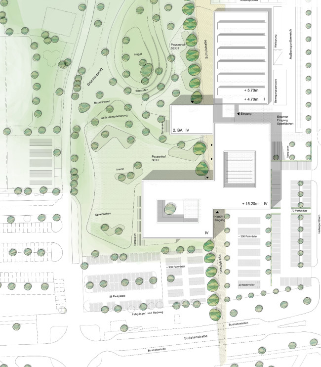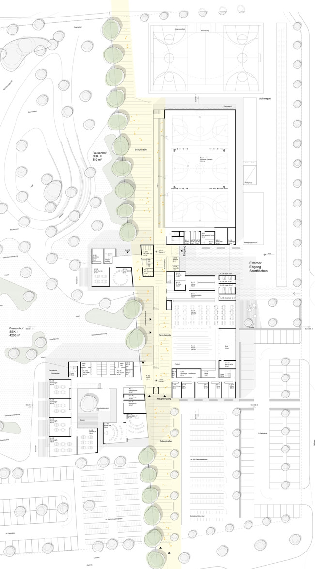 Der erhaltenswerte Baumstreifen auf dem Grundstück wird zum Anlass genommen, die Gesamtschule wie eine Perlenkette an einer Schulstraße aufzufädeln, die das künftige Rückgrat des Gebäudeensembles bildet. Die Schulstraße dient als Begegnungsraum zwischen Nutzern und Besuchern, welche von der Sudetenstraße kommend durch den Haupteingang Richtung Norden bis zur ebenfalls angeschlossenen Sporthalle geführt wird. Begleitet und gestärkt wird dieser Weg durch die erhaltenswerte Baumreihe, bis zu den nördlich anschließenden Freisportanlagen.