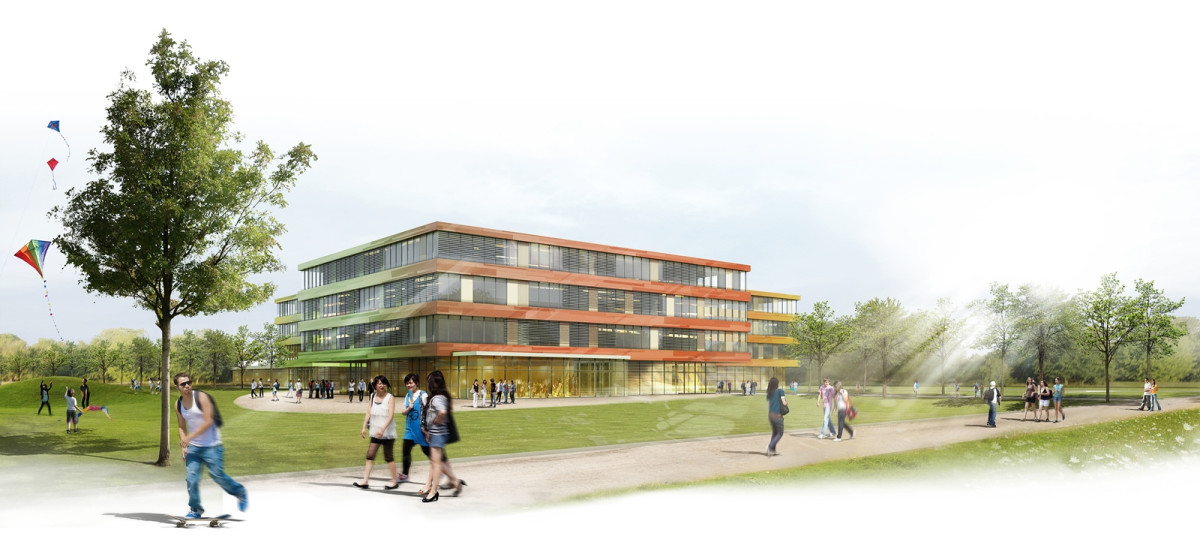 Das Grundstück der Gesamtschule Hürth befindet sich an der Nahtstelle zwischen Ortstrand und Übergang zum offenen Landschaftsraum. „Die Kette der solitären öffentlichen Bauten, die dem geschlossenen Wohngebiet in durchlässiger Weise vorgelagert sind, soll weiterentwickelt werden“.