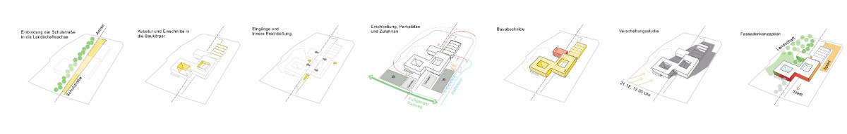 Die Schulstraße bildet künftig die räumliche Mitte, die sämtliche Funktionen verknüpft, in räumlicher, in akustischer und in visueller Hinsicht. Sie trägt bei zur Kommunikation und stärkt identitätsstiftend das schulische Zusammenleben. Der Schulstraße angelagert werden einzelne Baukörper, deren Kubatur den inneren Funktionen und dem funktionalen Ablauf einer Gesamtschule folgend geordnet sind. Die Baukörper des ersten Bauabschnitts gruppieren sich jeweils um einen Innenhof, diese befördern Tageslicht in die Flure und schaffen Orientierung.
