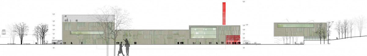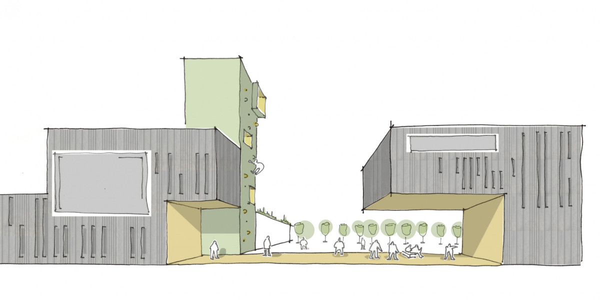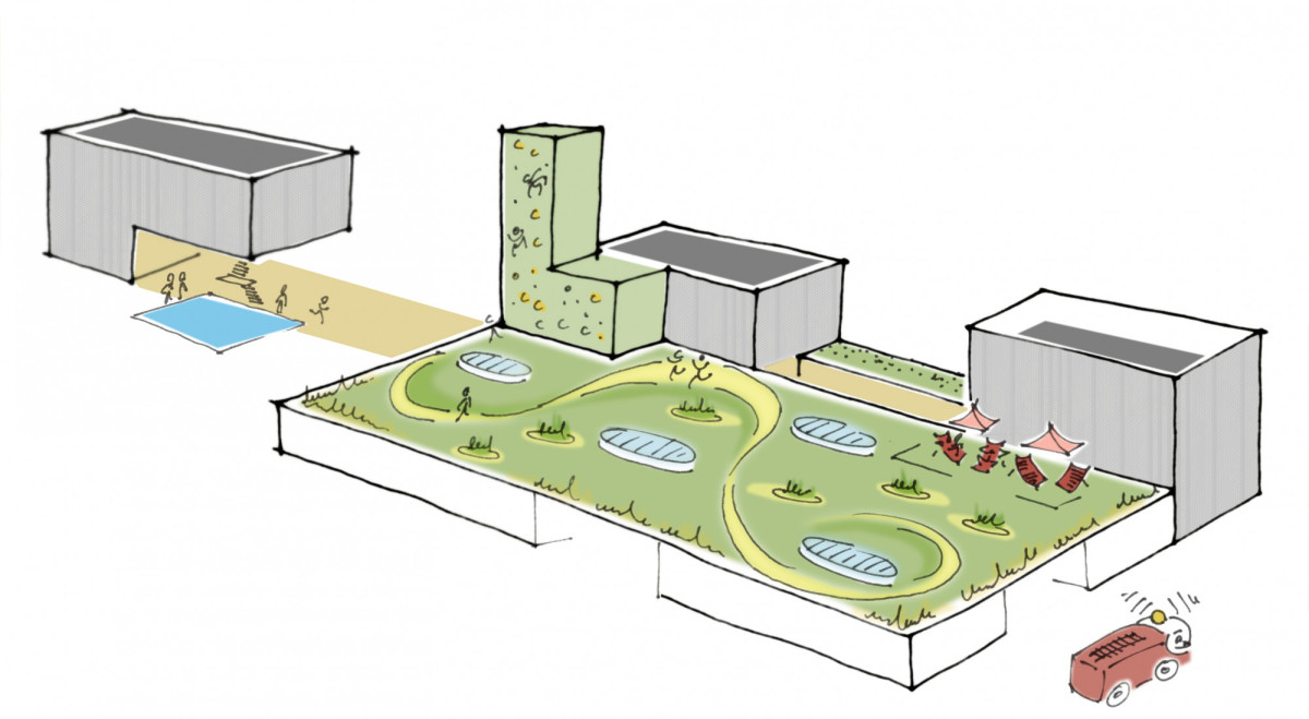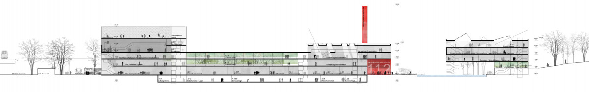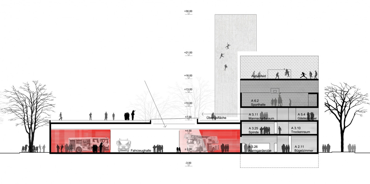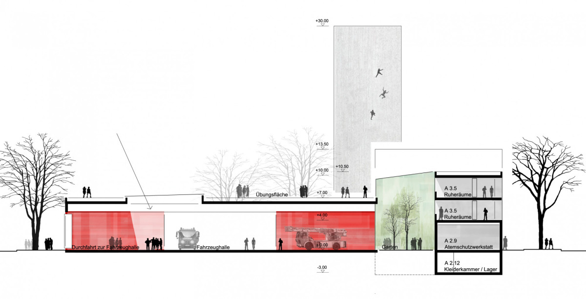 Aus dem begrünten Wall, entlang der Bahntrasse, bilden sich Grünzungen heraus. Im Bereich des Gewerbe- und Dienstleistungsgebietes sowie der Feuerwache werden die Grünzungen baulich als ein- bis zweigeschossige, begrünte Sockel ausgebildet. Diese bieten im Norden Dienstleistungen an, im Süden sind sie mit Parkgeschossen belegt. Die große Halle der Feuerwache bildet den begrünten Sockel unter dem Riegel der Wache.