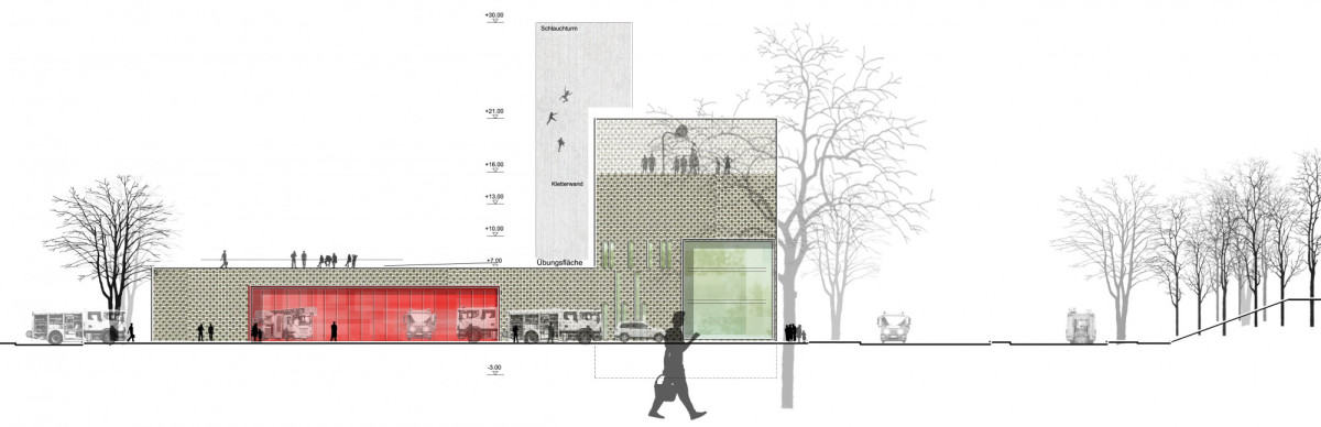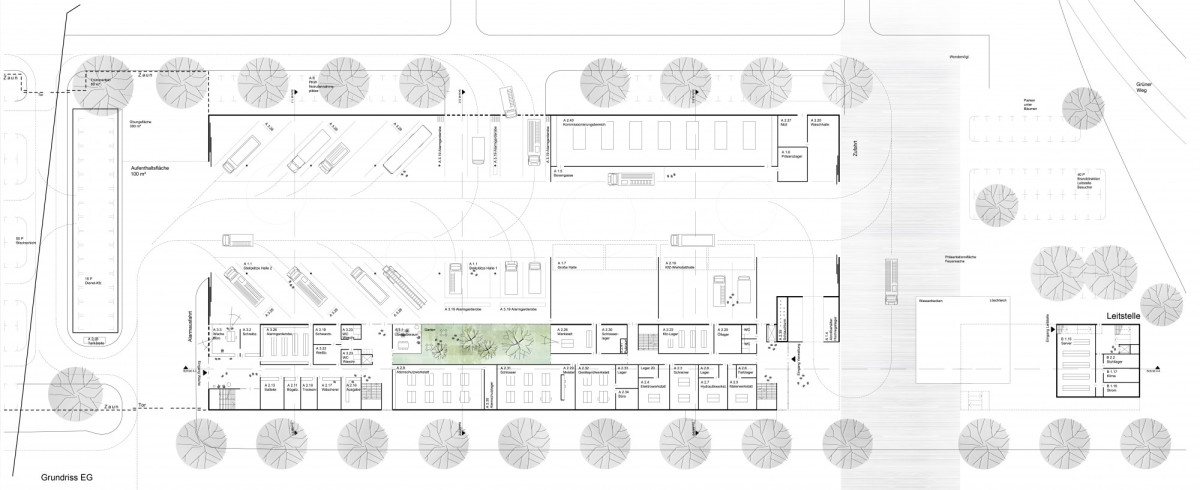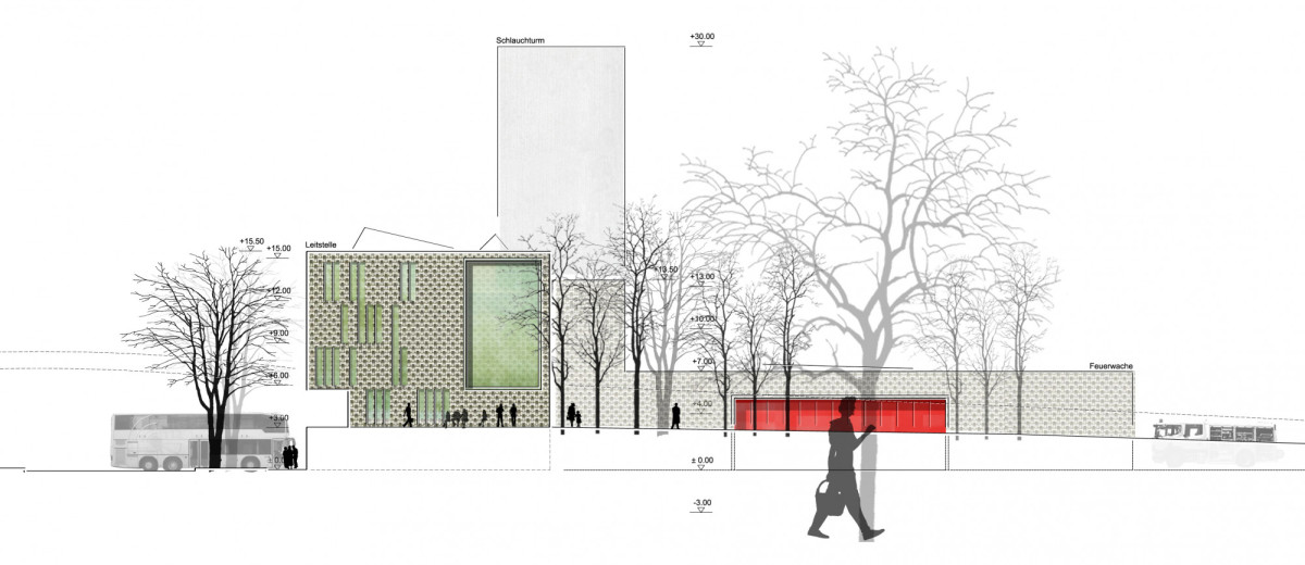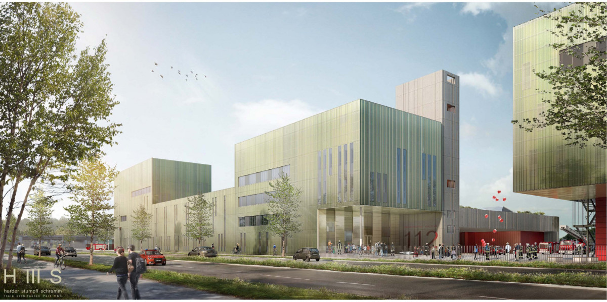 Der südöstliche Stadteingang von Karlsruhe soll zukünftig von der Feuerwache, einer Leitstelle und dem dahinter liegenden Gewerbe- und Dienstleistungsgebiet definiert werden. Die Bebauung bildet eindeutige Raumkanten und gibt dem Ort gemeinsam mit einer durchdachten Freiraumplanung und einer Vernetzung der verschiedenen Grünräume eine eigene, dem Ort angemessene Prägung. Der Stadteingang wird wahrnehmbar und bekommt eine ganz neue Qualität in der ansonsten heterogen strukturierten, von Verkehrsstraßen dominierten Umgebung.