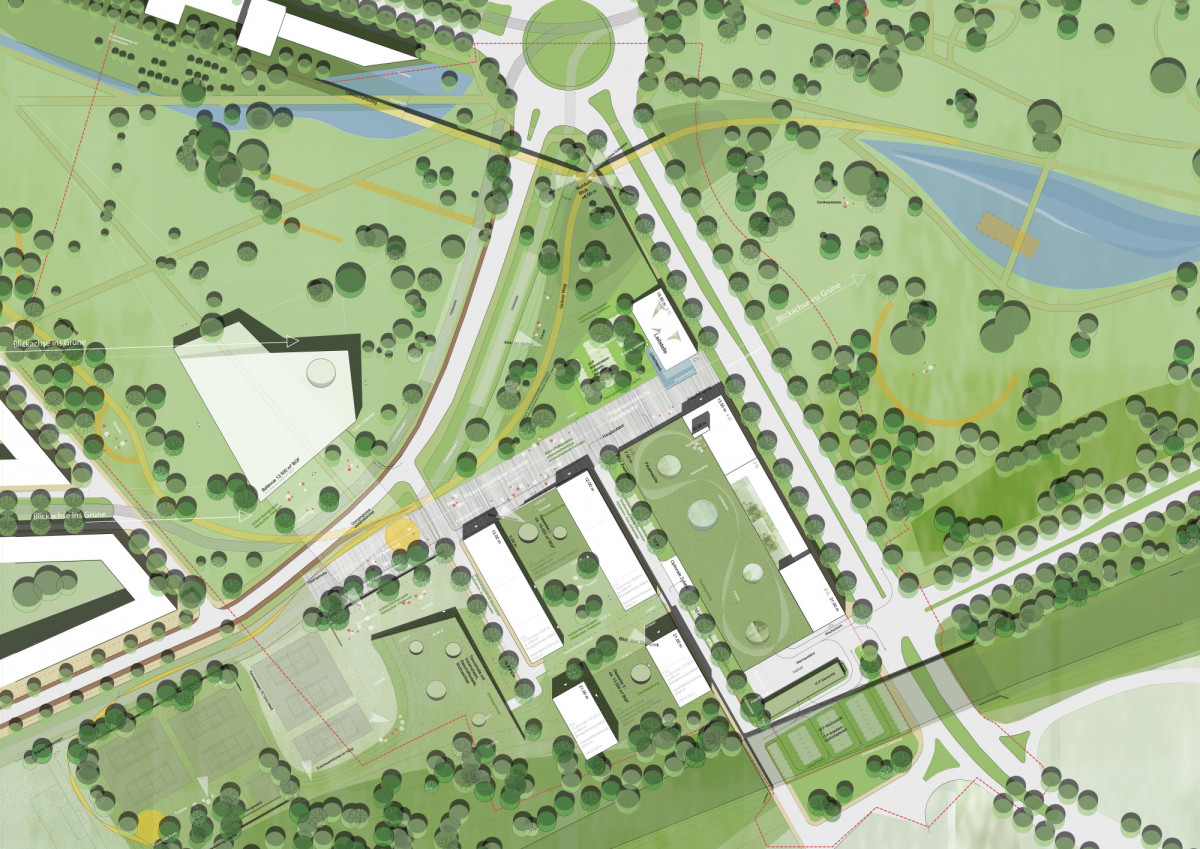 Die Grünzungen schaffen so die Verzahnung der Freiräume Stadtpark und Ostauepark – sowie den Rücken und Gegenpol zur vorhandenen Topografie der Esplanade. Auf eine attraktive Verbindung von Stadtpark und Ostauepark wurde besonderer Wert gelegt. Die neue Feuerwache fügt sich in das städtebauliche Konzept ein. Sie entwickelt sich entlang der Wolfartsweierer Straße und bildet so eine städtebauliche Kante zu dieser stark befahrenen Straße.