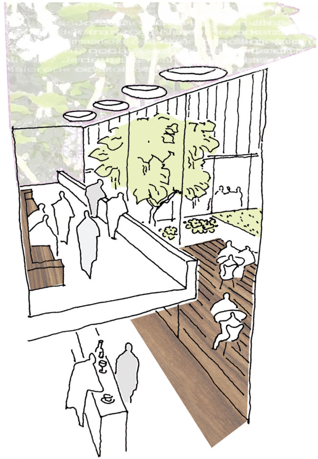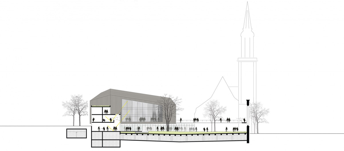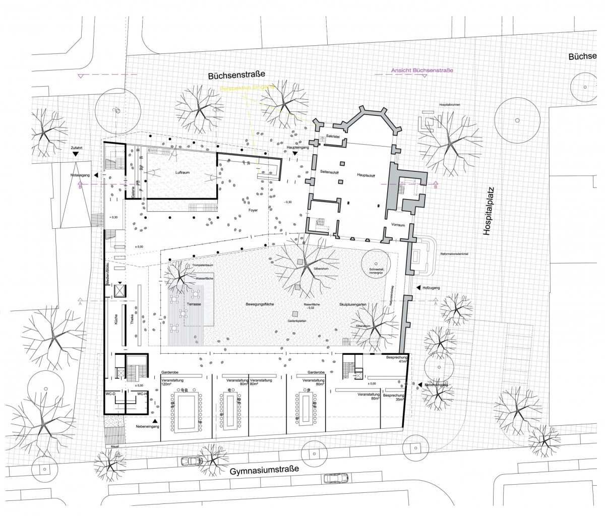 Die stadträumlichen Kanten des Veranstaltungsbereiches bestehen weiterhin. Lediglich die neue Erdgeschossfassade an der Büchsenstraße nimmt die Position der Fassade des ehemaligen Dominikanerklosters ein und erinnert so an den historischen Stadtraum. Die Veranstaltungsräume im Süden schließen erdgeschossig den Quartiersblock an der Gymnasiumstraße.