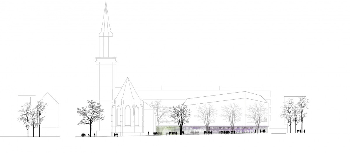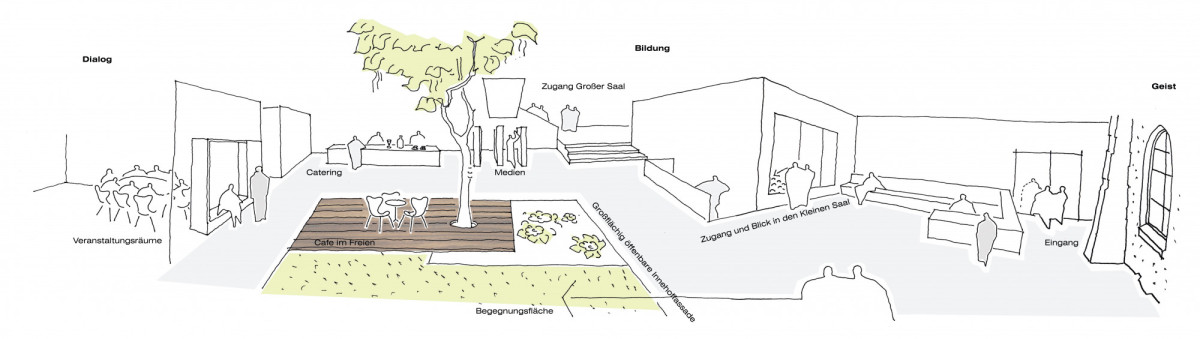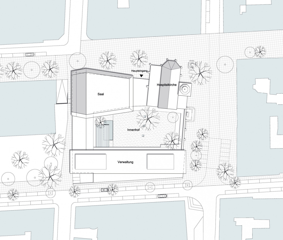 Im Sinne des Urhebers wird vorgeschlagen dieses Grundprinzip auch nach der Umgestaltung des Veranstaltungsbereiches beizubehalten. Durch das neue Konzept werden jedoch alle drei Bausteine, Geist, Bildung und Dialog entsprechend der Aufgabenstellung verknüpft. Die drei Bausteine Hospitalkirche, Verwaltungsgebäude und der große Saal bleiben erhalten und in ihrer Selbständigkeit ablesbar.