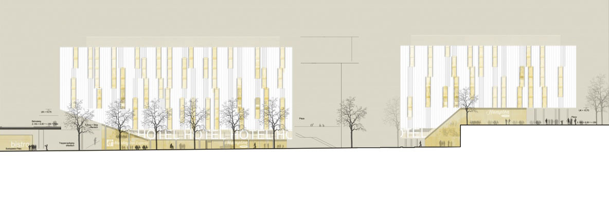 Das Preisgericht lobt ausdrücklich den städtebaulichen Ansatz, hier den öffentlichen Raum auf der oberen Platzebene im Bereich der U-Bahn Haltestelle aufzuwerten.