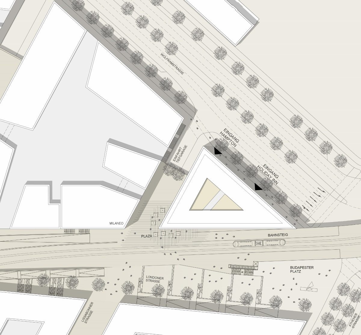Die Organisation der öffentlichen Bereiche entlang der Wolframstrasse, sowie zur Belebung der Haltestellenebene werden positiv bewertet. Auch die Diagonalverbindung dieser beiden öffentlichen Bereiche mittels einer Rolltreppe stellen eine Bereicherung der städtebaulichen Situation dar. Die räumliche Vielfalt und Organisation der Innenräume mit großzügigem Atrium wird ausdrücklich gelobt.