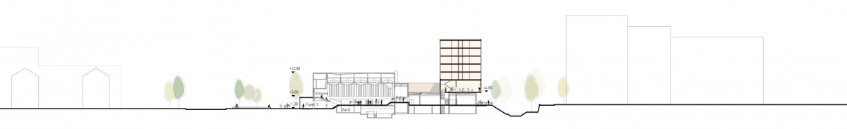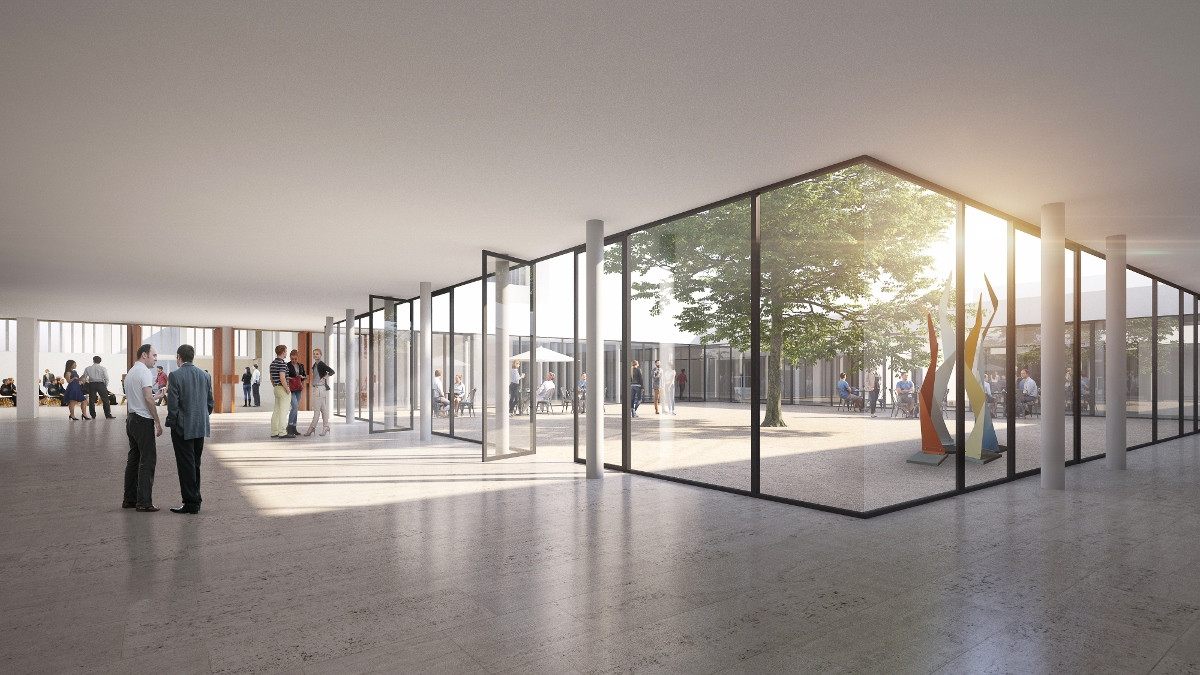 Durch die nördliche Foyer Erweiterung zur Südanlage und die Vergrößerung des oberen Foyers mit anschließendem Wandelgang sind in Zukunft Parallelveranstaltungen möglich. Die zentrale Anlaufstelle wird zusätzlich durch eine großzügige Empfangstheke markiert. Der verglaste Wandelgang ist Erschließungsverteiler aller umliegenden Nutzungen. Der Hof mit einem großen Schatten spendenden Baum soll multifunktional erlebbar werden: z. B: Empfang, Pausenhof, Lesungen, Gartencafé im Sommer etc.