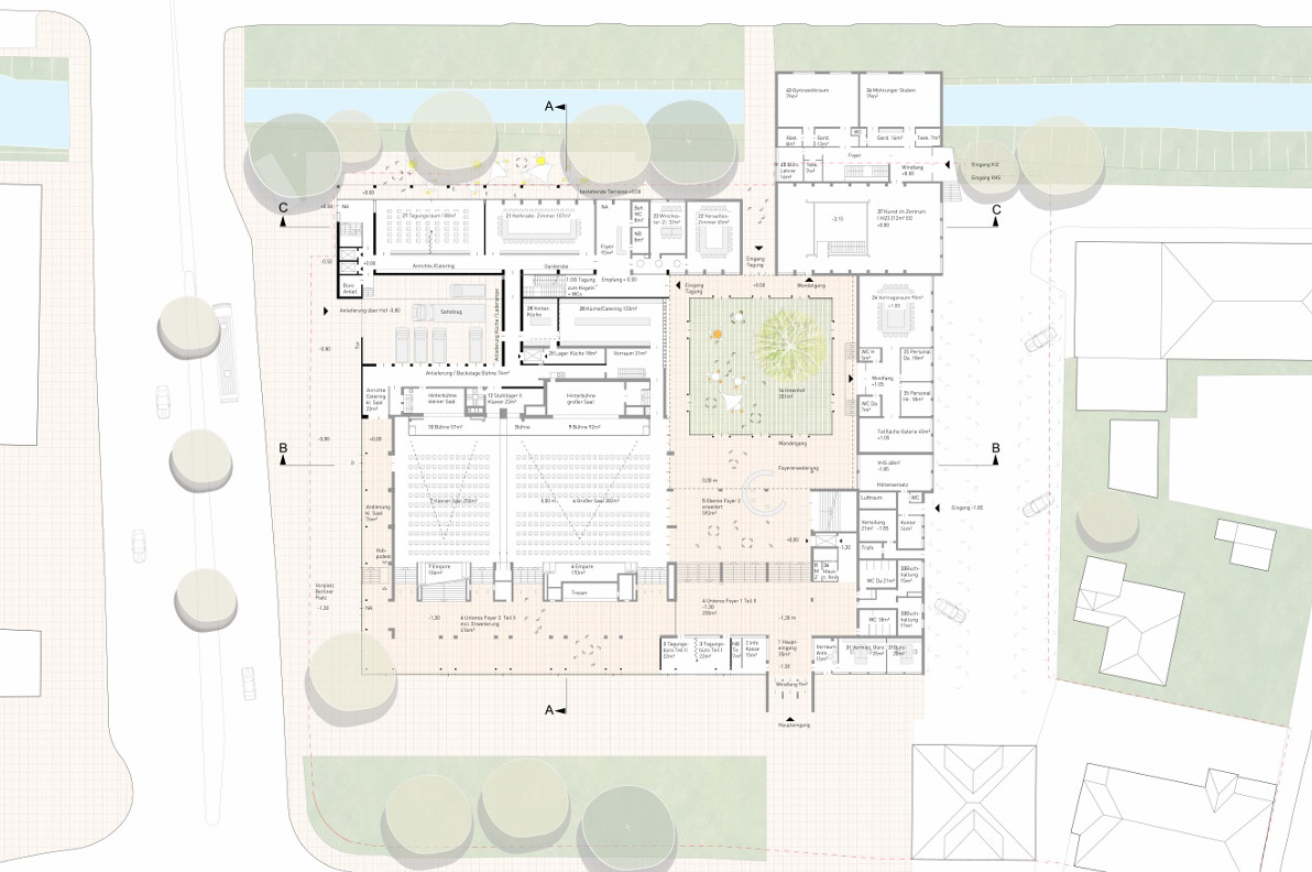 Durch den Wegfall von Restaurant und Wohnungen konnten die Funktionen neu geordnet werden. Alle Tagungsräume erhalten eine klare Zuordnung mit Orientierung nach Süden zur Wieseck. Durch die Schaffung eines Andienungshofes kann nun die Bestückung der Säle und der neuen Catering Küche reibungslos funktionieren, der Berliner Platz wird entlastet. Die Catering Küche ist zentral gelegen. Zukünftig kann sie auf schnellstem Wege die Kongresshalle, die Tagungsräume, das Foyer und auch das Gartencafé andienen. Die Andienung der beiden Säle (kleiner und großer Saal) erfolgt zukünftig östlich und westlich der Säle und unabhängig voneinander. Zusätzliche „Anrichte“ Räume ermöglichen einen reibungslosen Ablauf. Eine große durchgängige Bühne ist jetzt möglich. Der kleine Saal erhält ebenfalls eine Hinterbühne.