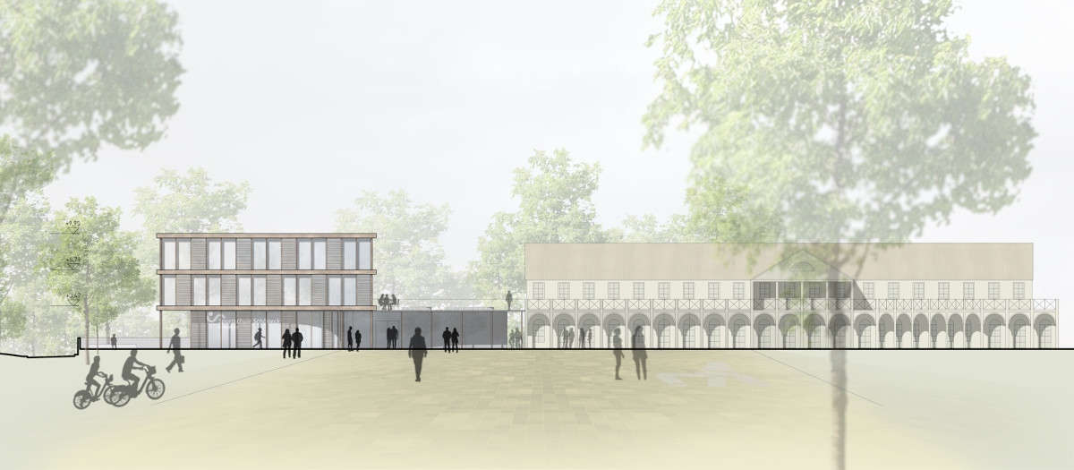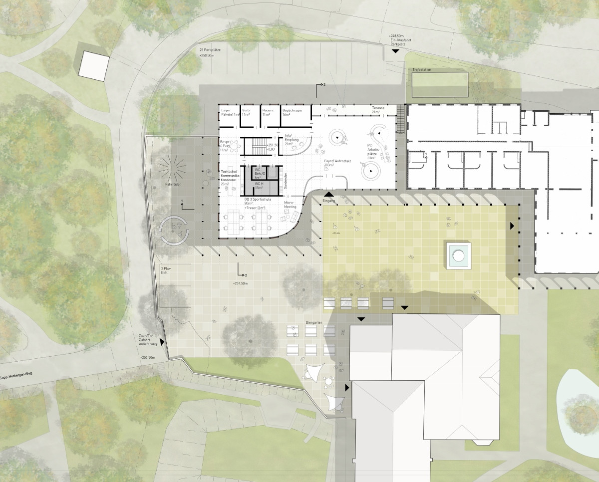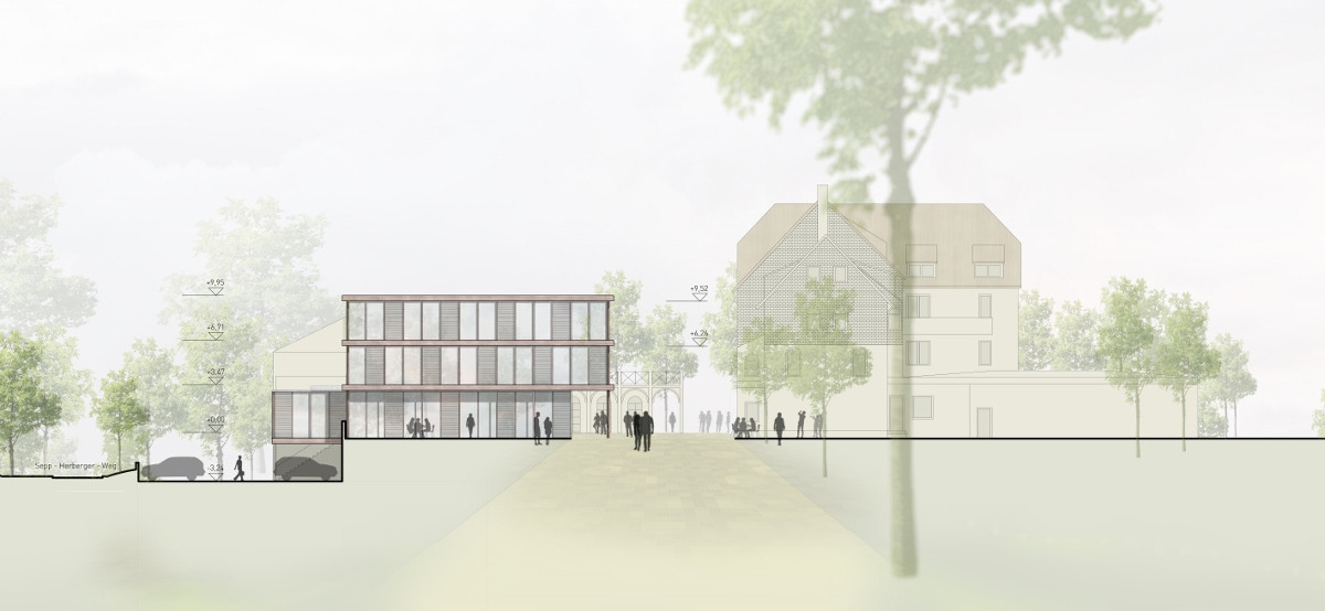 Mit seinem markanten dreigeschossigen Hauptbaukörper setzt der Entwurf einen gelungenen Auftakt beim Ankommen vom südlichen Sepp-Herberger-Weg, bildet einen angemessenen Raumabschluss des Innenhofes und steht in einem guten Bezug zum östlichen Bestandsgebäude mit seinem Biergarten.
